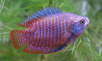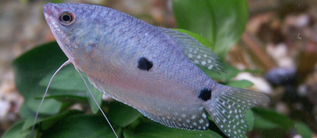 Der Blaue Fadenfisch (Trichogaster trichopterus) gehört zu den Labyrinthfischen. Das bedeutet, dass er ebenfalls über das sogenannte Labyrinthorgan verfügt, mit dem Fische auch Sauerstoff aus der Luft über dem Aquarium in ihrem Stoffwechsel verarbeiten können. Blaue Fadenfische erreichen eine Länge von bis zu 10 Zentimetern und kommen im natürlichen Habitus in Sumatra in Südostasien vor.